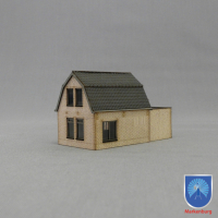 Das Dach ist mit niederländischen Ziegeln gedeckt und mit einer braunen Windborte abgeschlossen.