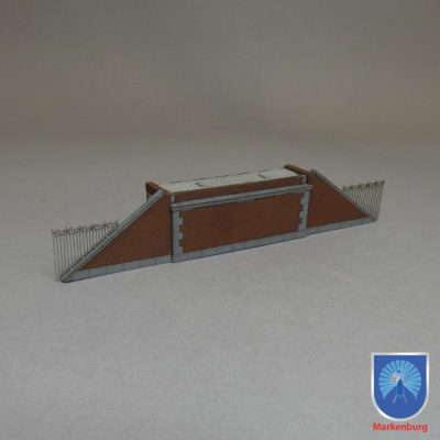 The abutment of this bridge consists of brickwork accentuated with natural stone elements. The abutment is suitable for double track and is still in active service as such. The rear of the abutment usually blends into the embankment on which the rails are located. Retaining walls on both sides of the abutment prevent the embankment from sliding onto the adjacent sidewalk.